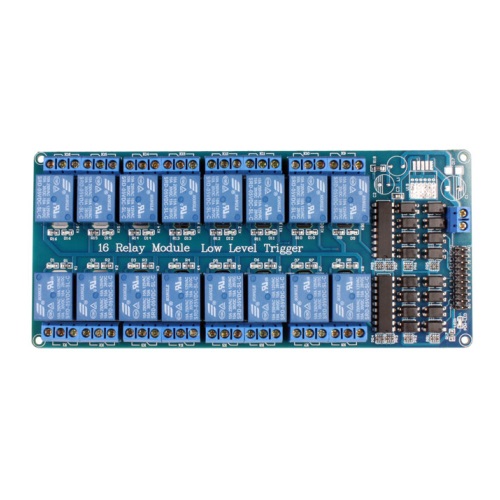 El módulo posee 16 Relays de alta calidad, fabricados por Songle, capaces de manejar cargas de hasta 250V/10A. Cada canal posee aislamiento eléctrico por medio de un optoacoplador y un led indicador de estado. Su diseño facilita el trabajo con Arduino, al igual que con muchos otros sistemas como Raspberry Pi, ESP8266 (NodeMCU y Wemos), Teensy y Pic. Este módulo Relay activa la salida normalmente abierta (NO: Normally Open) al recibir un «0» lógico (0 Voltios) y desactiva la salida con un «1» lógico (5 voltios). Para la programación de Arduino y Relays se recomienda el uso de timers con la función «millis()» y de esa forma no utilizar la función «delay» que impide que el sistema continúe trabajando mientras se activa/desactiva un relay.