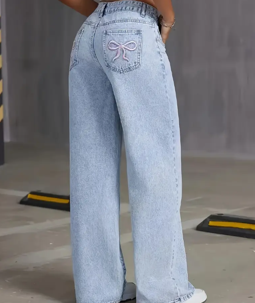 Jeans Anchos de Pierna Alta para Mujer en Tejido Denim Azul Claro con Detalle de Mariposa